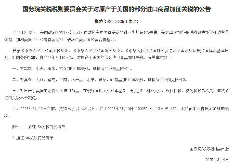 根据我国《中华人民共和国关税法》、《中华人民共和国海关法》、《中华人民共和国对外贸易法》等法律法规以及国际法基本原则,经国务院批准,自2025年3月10日起,将对原产于美国的部分进口商品加征关税。具体加征情况如下: