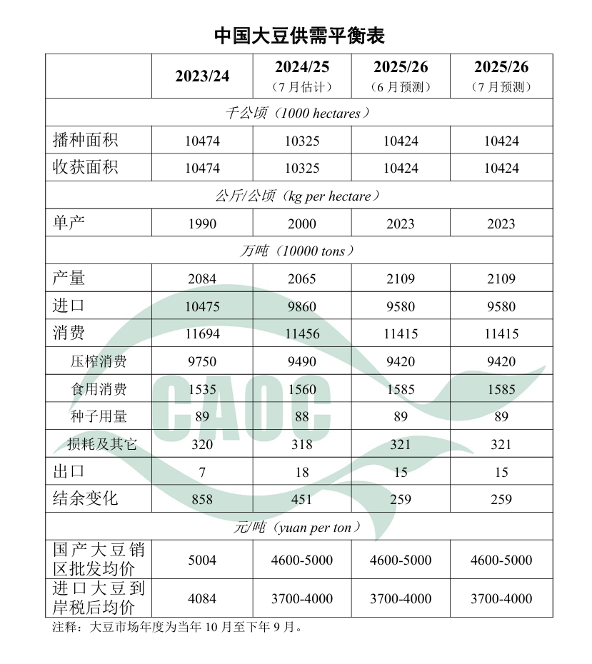 2025/26年度中国大豆供需预测与上月持平。受高温天气影响,豆制品保质期缩短,大豆消费需求减弱。从生产端看,东北主产区大部土壤墒情适宜,光温水条件总体有利,大豆长势良好;黄淮海地区夏大豆已完成播种,6月末河南、山东等地的降雨显著缓解前期旱情;湖北早熟大豆陆续上市,水分低、品质好于上年。国际方面,全球大豆产量预计延续增势,供需维持宽松格局。北半球大豆进入生长关键期,国际大豆价格将随着主产区天气震荡运行。