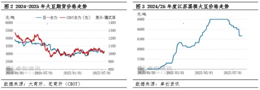 具体来看,南北价差过大是近期南方大豆价格回调的最主要原因。由于东北产区较销区市场运距较远、蛋白含量低于南方产区杂花豆2个百分点左右,因此两市场之间正常的价差约在500元/吨上下。但随着南北大豆产量差距持续拉大,造成南方豆价格不断攀升,南北价差拉大,卖方变现意愿不断变强。2024年南北大豆价差均值为372元/吨,截至7月22日,2025年南北价差均值为1095元/吨,较2024年扩大723元/吨。尤其在2025年3月时,东北大豆价格先涨后落,下跌后现货价格甚至低于上涨前报价;而南方产区价格上涨超10%,后期回落空间不足1%。
