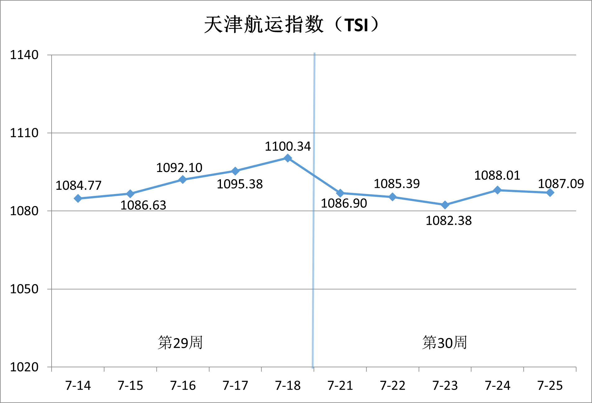 新华财经天津7月28日电(记者李亭)记者从天津国际贸易与航运服务中心获悉,2025年第30周(7月21日-25日),中国北方内外贸海运价格的风向标——天津航运指数周初快速下跌后窄幅震荡,最终收于1087.09点,相比7月18日(第29周最后一个发布日)累计下跌13.25点,累计跌幅1.20%。