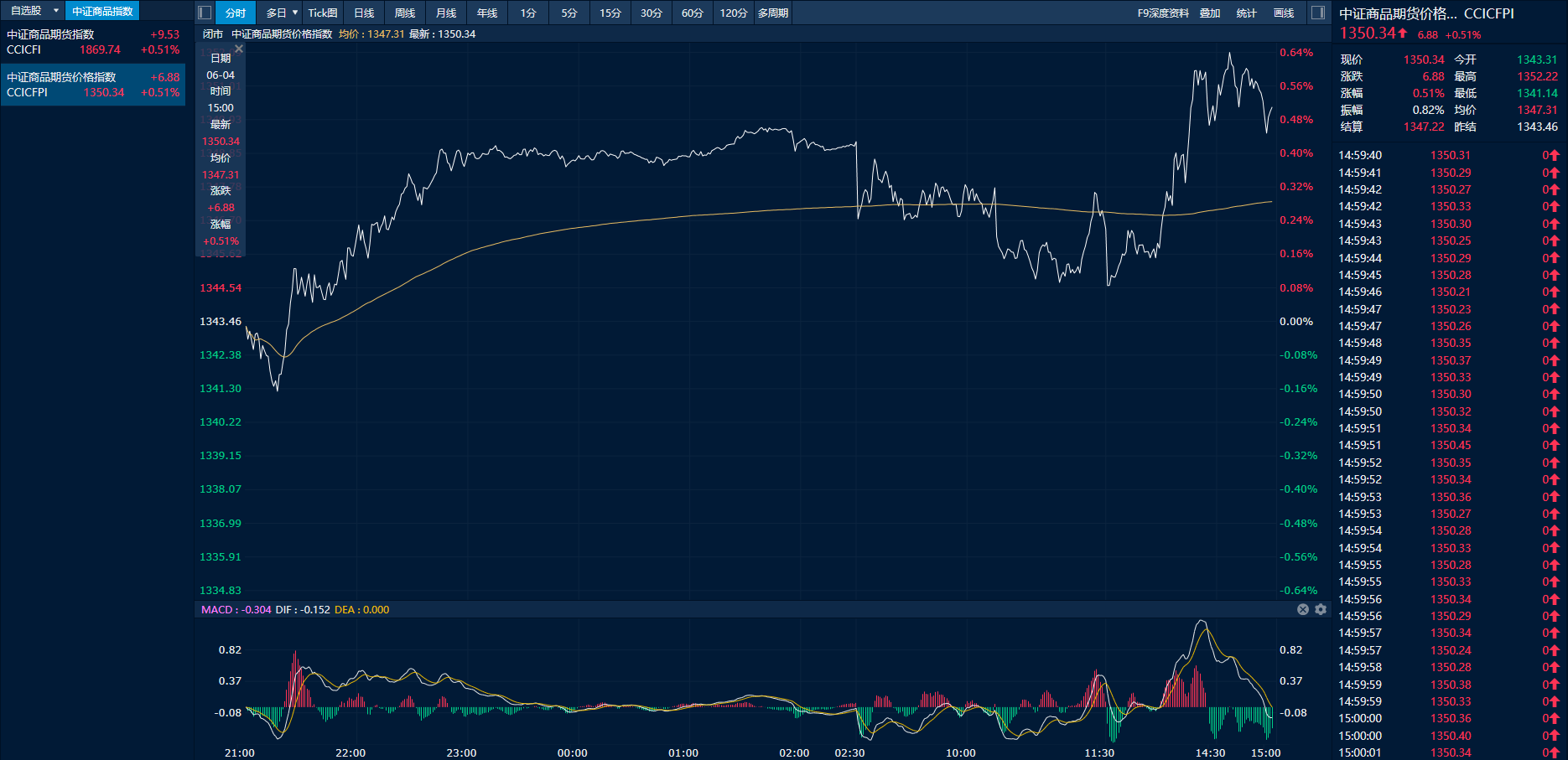 截至4日下午收盘,中证商品期货价格指数收报1350.34点,较前一交易日上涨6.88点,涨幅0.51%;中证商品期货指数收报1869.74点,同样较前一交易日上涨9.53点,涨幅0.51%。