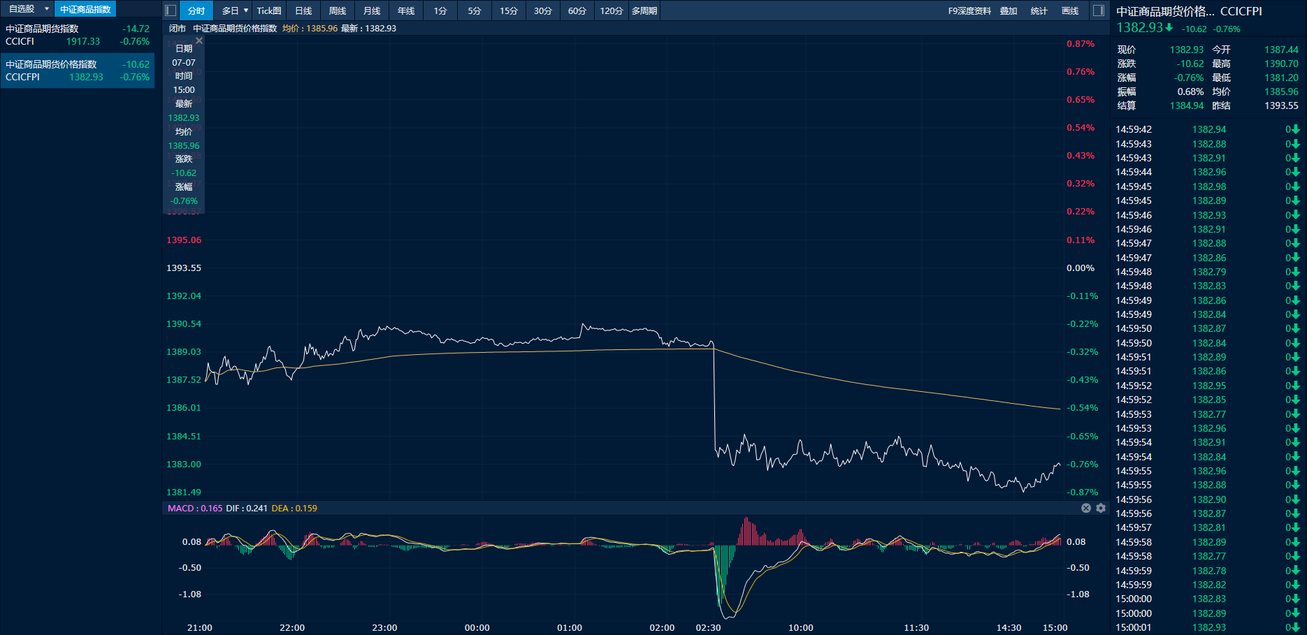 截至7日下午收盘,中证商品期货价格指数收报1382.93点,较前一交易日下跌10.62点,跌幅0.76%;中证商品期货指数收报1917.33点,较前一交易日下跌14.72点,跌幅0.76%。