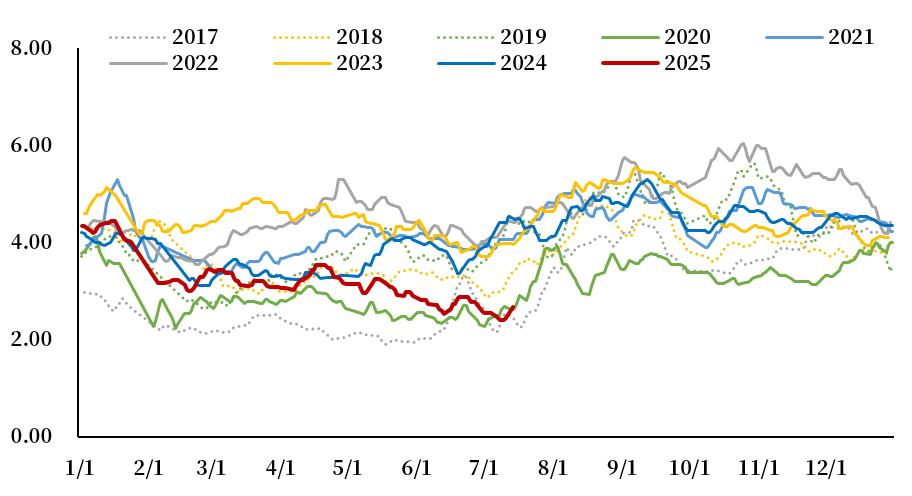 市场对季节性反弹分歧聚焦启动时点和反弹幅度。今年梅雨季长,现货7月初再创新低,多头预期落空,盘面估值下调。对反弹幅度也有分歧,乐观观点认为现货价格将有1-1.5元/斤涨幅,但供给高位和中秋时点偏晚,反弹幅度或压缩。