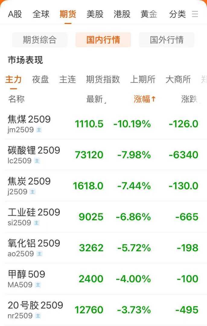 7月28日周一开盘,商品期货市场行情突变,早盘全线回调。截至早盘收盘,国内期货主力合约多数下跌,其中焦煤跌超10%,焦炭、多晶硅等跌超6%,碳酸锂期货主力合约触及跌停。