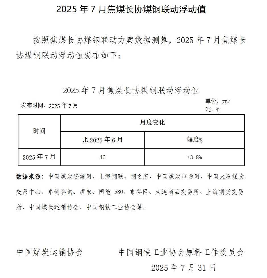 根据焦煤长协煤钢联动方案数据,2025年7月焦煤长协浮动值达46元/吨,较6月上涨3.8%,这一变化对煤钢产业链企业具有重要参考意义。