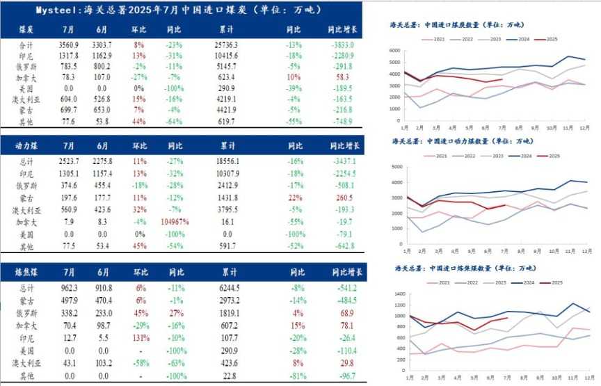 随着6月后期焦煤价格持续上涨,带动进口利润改善,从统计局数据看到,7月焦煤进口量环比增加51.5万吨,环比增加6%,虽然同比依旧比减少11%,但累计同比已经在收窄,其中像俄罗斯和蒙古进口量都在增加,焦煤市场迎来积极变化。
