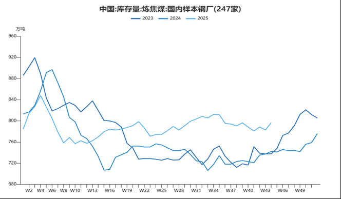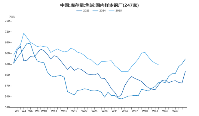 同时,近日国家发展改革委组织召开2025—2026年供暖季能源保供视频会议。会议要求,各地区、有关企业要切实做好供暖季能源保供工作。一是稳定能源生产供应,加强煤炭生产组织和运输保障,保持对存煤15天以下电厂动态清零。根据Mysteel资讯,12日陕西地区大部分煤矿正常生产销售,煤炭整体供应基本稳定,坑口个别煤矿开始下调价格。进入11月中旬,民生采暖用能保障相较于安全生产工作更突出,这也是影响盘面情绪走弱原因之一。焦煤市场受政策与供需双重影响,波动频繁。