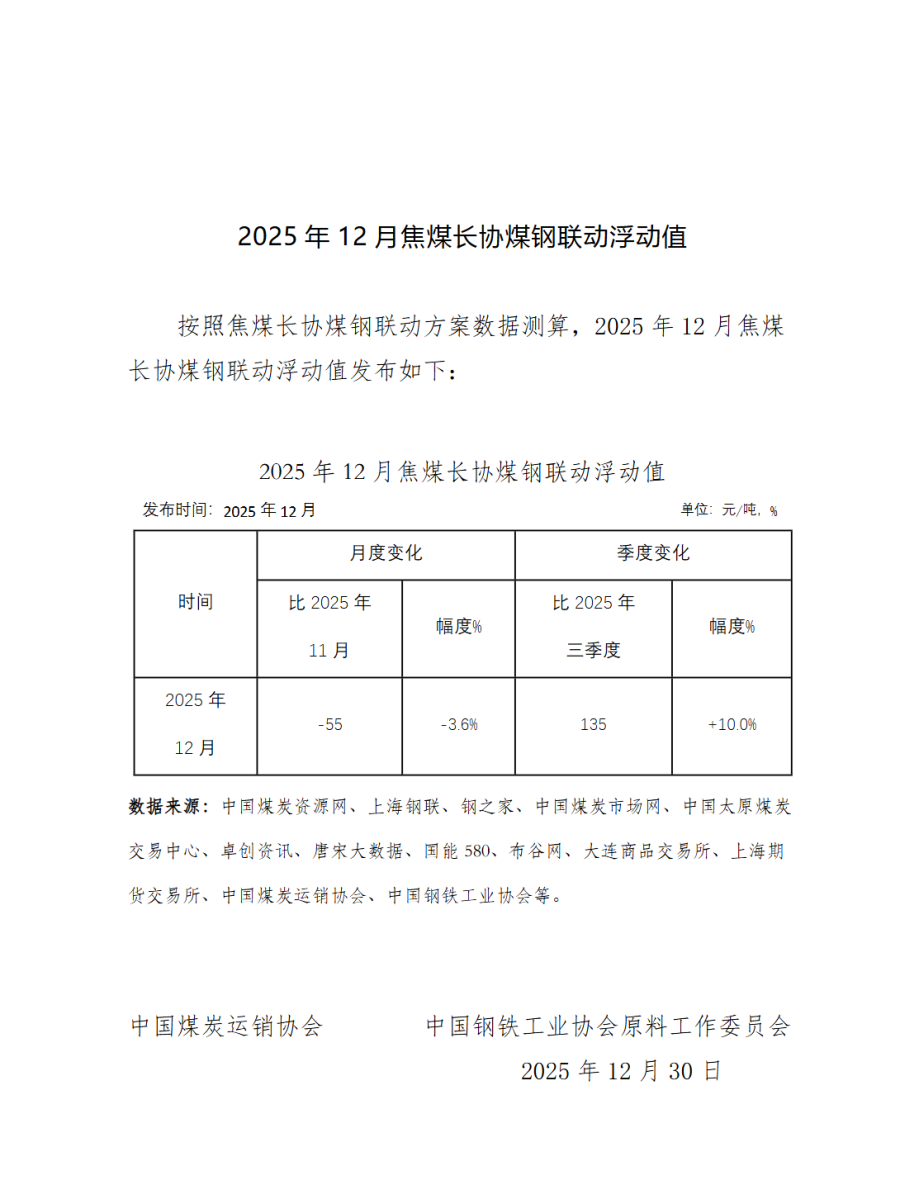 按照焦煤长协煤钢联动方案数据测算,2025年12月焦煤长协煤钢联动浮动值比2025年11月下跌55元/吨,跌幅3.6%。