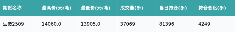 南财智讯6月24日电,南财金融终端盘后期货数据显示,大连商品交易所的生猪主力合约收跌0.14%,收盘报13940.0元/吨,这一价格变动反映了当前生猪期货市场的活跃情况。日内资金流入1.44亿元,显示出市场对生猪期货的关注度持续升温。生猪期货作为农产品期货的重要组成部分,其价格波动对养殖业、肉类加工行业等具有重要影响。其他相关指标见下表: