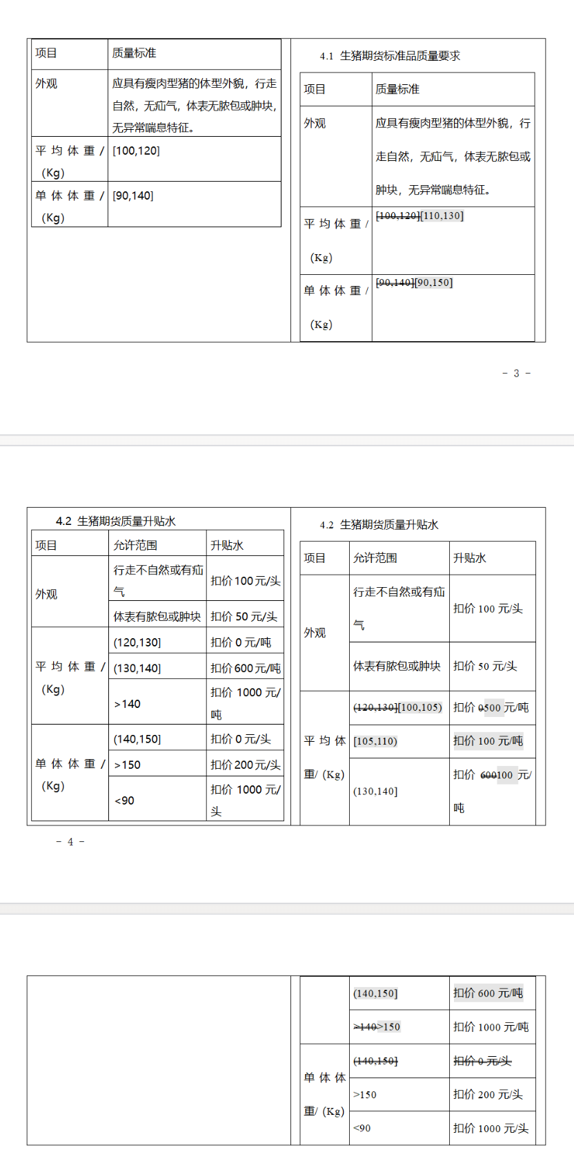 一是修改交割标准品的平均体重和单体体重范围。平均体重(Kg)由[100,120]调整为[110,130];单体体重(Kg)由[90,140]调整为[90,150],并相应删除原单体体重(Kg)(140,150]扣价0元/头的规定。
