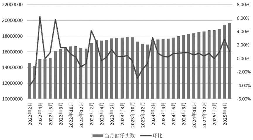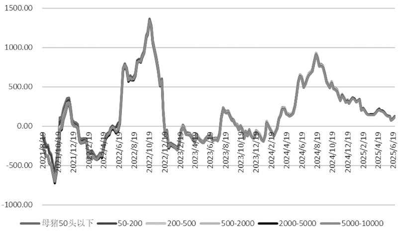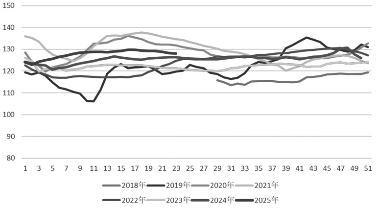 2025年上半年生猪体重始终维持高位。相关机构数据显示,上半年商品猪出栏均重为127.69kg,显著高于过去5年同期均重125.49kg和去年同期均重124.41kg。一方面,上半年饲料价格维持低位,养殖成本下滑;另一方面,根据成本测算,最优体重有一定提高,不论集团还是中小散养殖体重均有所上升。体重的持续上行,虽然对上半年猪价形成了一定的托底作用,但也导致供应持续后移。从绝对值来看,上半年生猪体重仅低于2020年和2021年同期,但这两个年份生猪产能还没有恢复,且2021年高均重曾带来价格的大幅下跌。