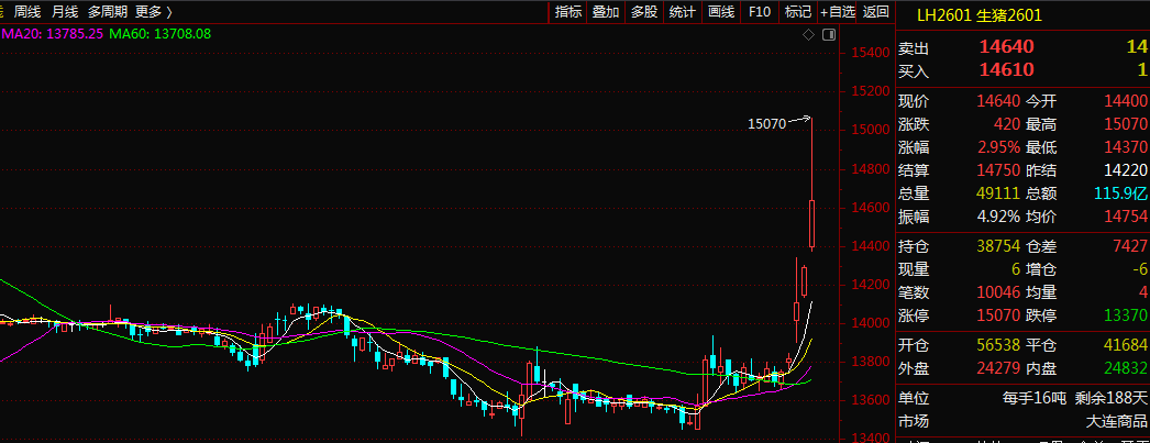 周三早盘,一则关于“农业农村部畜牧兽医局拟于7月23日在北京召开推动生猪产业高质量发展座谈会”的消息点燃了生猪期货的上涨热情,生猪期货2601合约盘中一度涨停。与此同时,A股生猪养殖板块也集体上涨。