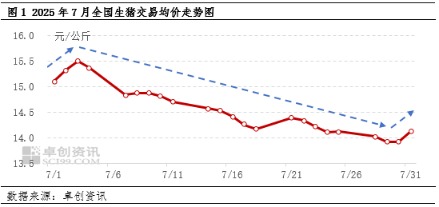 7月全国生猪价格先涨后跌再小幅反弹,因养殖端集中降重出栏致供大于求,二次育肥支撑不足。展望8月,预计猪价或环比下滑,呈短涨长跌态势,均价或为14.23元/公斤。