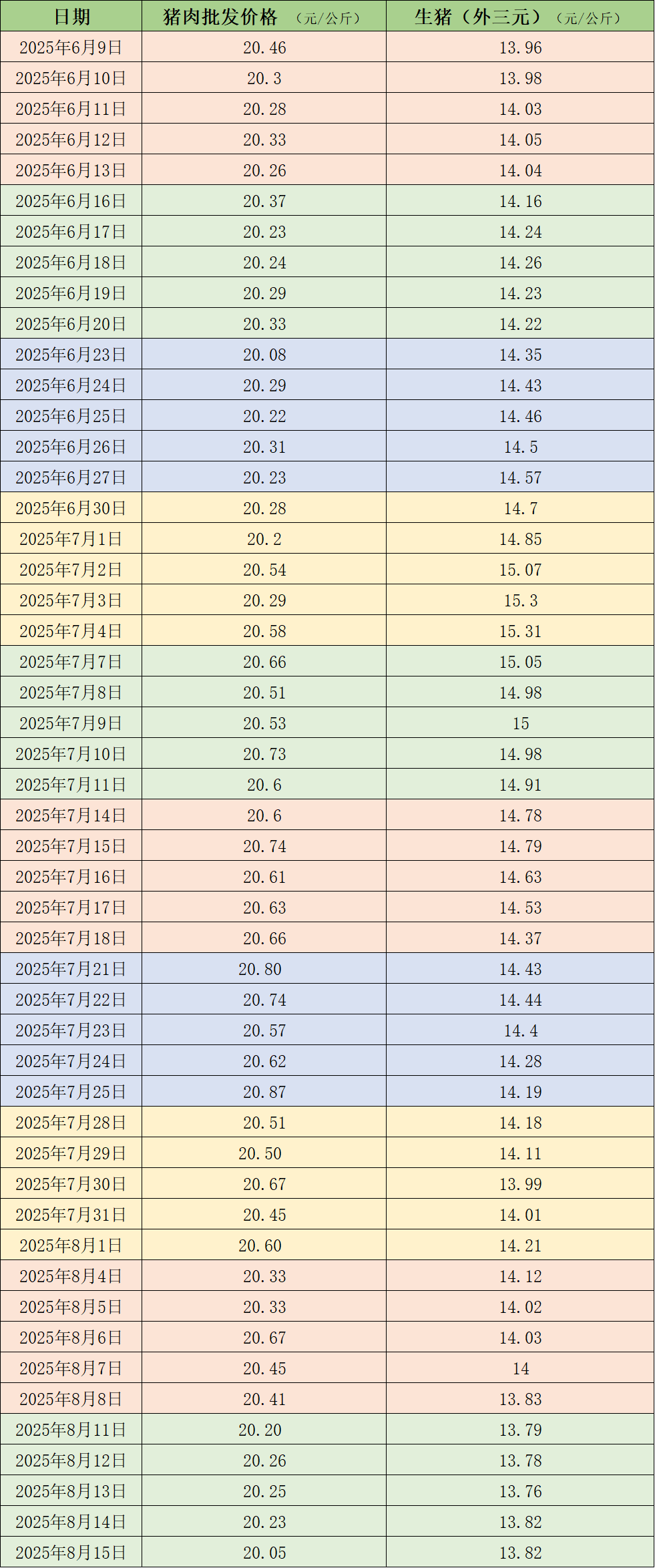8月14日,国家统计局发布2025年8月上旬流通领域重要生产资料市场价格变动情况,其中生猪(外三元)价格为13.9元/公斤,与7月下旬相比,每公斤下降0.2元,下降幅度为1.4%。