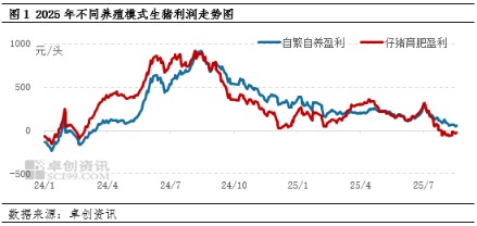 2025年生猪养殖利润与2024年相比缩水幅度较大。根据卓创资讯监测,截至8月19日,2025年自繁自养生猪盈利均值196.64元/头,同比下滑58.98元/头,同比跌幅23.07%,最高点为1月6日的385.42元/头,最低点为8月18日的50.70元/头;仔猪育肥年均值为166.18元/头,同比下跌259.17元/头,同比跌幅60.93%,最高点为4月15日的361.90元/头,最低点为8月8日的-64.85元/头。