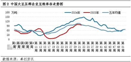 进一步从豆粕市场本身来看,虽然经历了自4月底以来上游企业豆粕库存的持续累积,但目前全国豆粕库存连续两周环比下滑,年内库存高点或已出现。卓创资讯监测数据显示,截至8月第1周全国大豆压榨企业豆粕库存为94.9万吨,较高点下降5.3万吨,但仍为年内高位水平。从当下天气条件及大豆存量来看,上游企业仍面临开工压力,催提为市场常态,部分压制豆粕价格。但下游刚性需求支撑较强,且上游通过催提、调整生产计划等手段严格控制库存情况,豆粕库存或难超越7月底高点水平。
