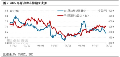 分析来看,一方面,近期国际原油市场承压明显,对棕榈油价格形成利空影响。首先,美经济数据疲软打压市场情绪。美国7月非农就业数据意外走弱,且前值遭遇大幅下修,显示劳动力市场降温迹象,引发市场对经济前景的担忧,避险情绪升温。另外,供应端压力持续加大。欧佩克+增产计划继续施压,宣布9月起日均增产54.7万桶,导致市场供应量增加,国际原油价格震荡下行。随着原油价格回落,其作为生物柴油原料的经济性提升,可能削弱棕榈油在生物燃料领域的替代需求,导致马棕期价跟随原油价格回落。截至8月7日收盘,WTI原油期货结算价为63.88美元/桶,较7月31日下跌5.38美元/桶或7.77%。