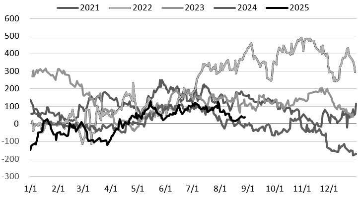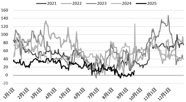 8月,印度港口的棕榈油较豆油和葵油仍具备价格优势。截至9月16日,印度港口毛豆油与毛棕榈油的价差为41美元/吨,高于2024年同期的-25美元/吨;毛葵油与毛棕榈油的价差为115美元/吨,高于2024年同期的15美元/吨,棕榈油期货市场相对强势。