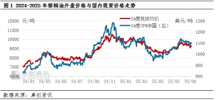9月棕榈油市场在前期利多因素消化后,价格高位偏弱调整。然而在产地“供弱需强”格局的支撑下,主产国挺价意愿较强,报盘延续高位。截至9月30日,当月内24度棕榈油CFR中国参考价格为1106美元/吨,完税后平均进口成本约9438元/吨,环比8月微跌0.24%。国内方面,24度棕榈油现货月均价为9378元/吨,环比下跌0.17%。整体来看,月内进口成本仍处高位,一定程度上抑制现货跌幅。
