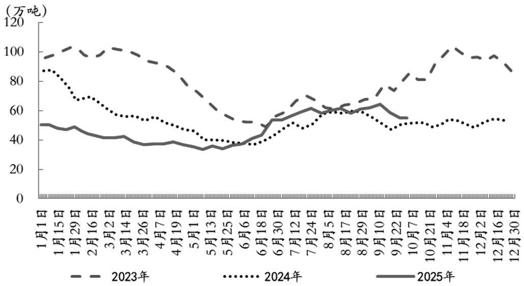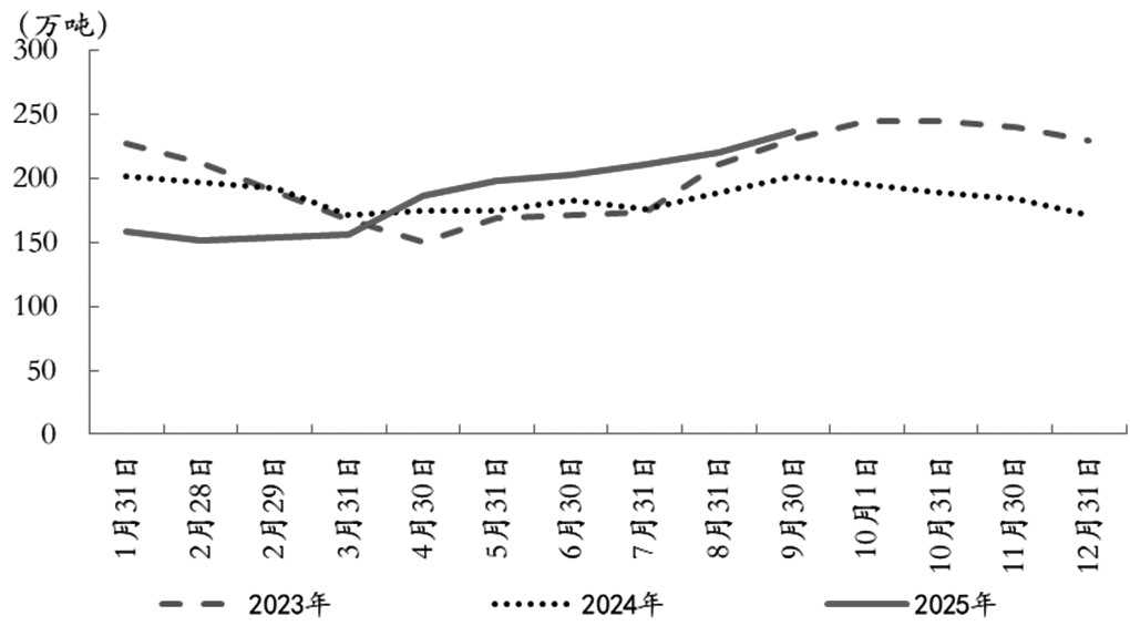 从需求端看,马来西亚棕榈油出口疲软与国内消费收缩并存。其中,出口量环比仅增7.7%,至142.8万吨,低于市场预期的145万~150万吨,主要因中国买船衔接不畅及印度转向豆油采购所致。国内消费同比锐减33.2%,至33.35万吨,或与斋月后需求回落及生物柴油掺混政策执行放缓有关。综合来看,马来西亚棕榈油库存超预期累积,供需格局维持宽松。9月月末库存环比激增7.2%,至236.1万吨,远超市场预期的215万~220万吨,创2024年12月以来新高,标志着马来西亚棕榈油市场从供需紧平衡转向宽松。