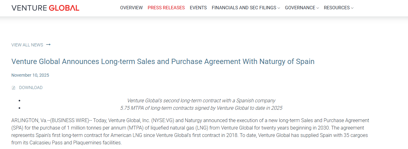 他补充道:“这份合同不仅将对美国与西班牙之间的贸易平衡产生积极影响,还将强化整个地区的能源安全。凭借我们在建设和执行上的高效能力,使Venture Global成为全球市场值得信赖、稳定可靠的供应商。此次协议的签署,加之过去六个月强劲的商业势头,充分体现了客户对我们公司的持续信心,以及全球对LNG的强劲需求。Venture Global将继续致力于以灵活、迅速、可负担且可靠的长期供应来满足这一需求。”