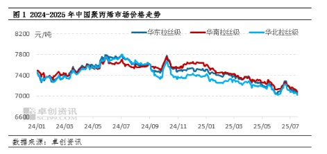 具体来看,进入2025年中国聚丙烯主要市场走势趋同,三大区市场价格皆呈现震荡下行走势,区域价差也逐步收窄。以拉丝为例,截至7月18日,华东拉丝均价在7094.29元/吨,较1月月均价下跌4.62%;华南拉丝均价在7125.00元/吨,较1月月均价下跌5.11%;华北拉丝均价在7056.79元/吨,较1月月均价下跌3.40%。华东-华北拉丝价差从1月份的85-150元/吨收窄至25-55元/吨;华东-华南拉丝价差从1月份的(-105)-(-40)元/吨收窄至(-50)-(-15)元/吨。