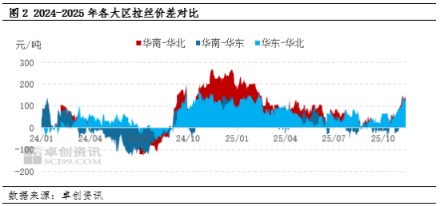这主要是因为,一方面,近期华北区域拉丝价格下跌幅度最大,华南和华东区域拉丝价格相对坚挺,使得三大区拉丝价差出现差异。上半年华南和华北区域今年新投装置较多,在供应增加的压制下,其区域内拉丝市场价格下跌幅度增加,下半年华东、华南与华北的价差进一步收窄至0-50元/吨左右。另一方面,10月份以来,虽然华东和华南区域新增了大榭石化二期一线和广西石化二期装置投放,但同时新增了多套计划外的装置检修,不仅对冲了新装置投产带来的压力,更导致部分地区出现结构性货源偏紧的情况,致使华东和华南区域拉丝价格跌幅相对较小;而华北在大产能基数较大带来的供应压力下,价格连续下跌,最终导致华南、华东与华北的价差走阔至100元/吨以上。市场供需变化影响区域价差走势。