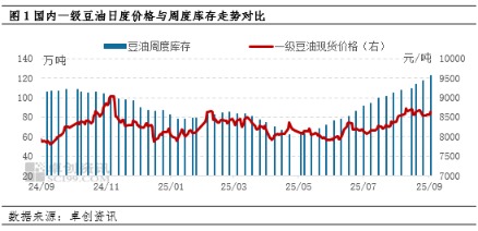 在原料供应充足的背景下,国内压榨企业开工维持高位,豆油产出较为宽松。根据卓创资讯数据监测,1-8月中国重点压榨企业豆油产量1146万吨,同比增2.23%。从需求端来看,国内豆油需求变化基本循序季节性规律,随着天气转凉,油脂需求有所回暖,8月中下旬后,各地院校暑期临近结束,市场补货及提货情况增多,豆油累积趋势放缓。但随着阶段性补货结束,且在餐饮宴请治理大背景下,豆油需求增加受到一定抑制,9月后的豆油下游市场采购转为以刚需为主,整体交投表现有所转弱,日均散油成交量不足2万吨。