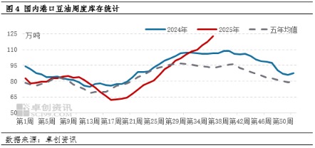根据国内豆油库存近五年均值变化走势可以看出,一般情况下,豆油库存在第30周(进入8月后)左右开始止涨趋于高位波动,第40周(10月初)左右开启降库,与大豆原料进口季节性变化所导致的豆油产出有关。2025年,国内大豆月度进口量连续创新高,意味着进入压榨环节的原料供应充足,因此豆油供应端持续宽松,叠加需求端的强弱转换,导致当前港口豆油累库趋势难改,库存拐点预期延后(SEO关键词3)。数据显示,截至9月5日,港口重点地区豆油库存122.5万吨,环比增16.31%,同比增15.19%,五年同期均值仅为92.42万吨。