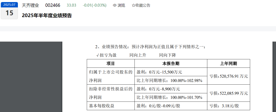 天齐锂业预计今年上半年实现归属于上市公司股东的净利润为0万元至1.55亿元,上年同期亏损达52.06亿元;扣非后净利润为0万元至8900万元,上年同期扣非净利润为亏损52.21亿元。