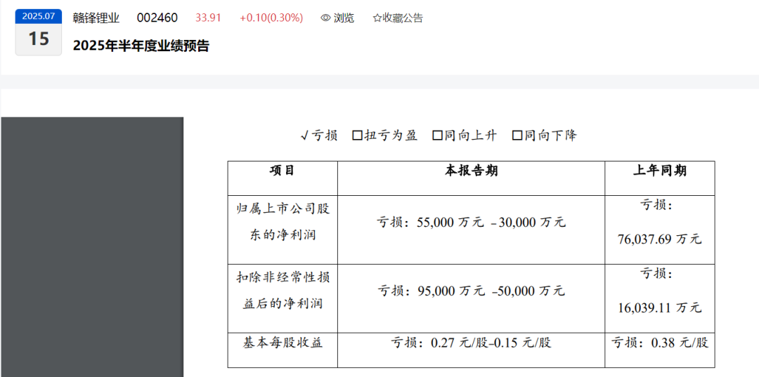 赣锋锂业预计今年上半年实现归属于上市公司股东的净利润为-3亿元至-5.5亿元,上年同期亏损7.6亿元;扣除非经常性损益后的净利润为-5亿元至-9.5亿元,上年同期扣非净利润为亏损1.6亿元。