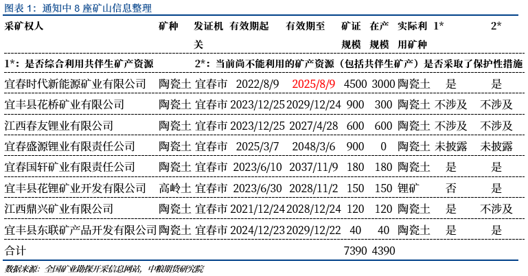 7月14日,宜春自然资源局文件要求辖区内8座大型矿山于9月30日前提交储量核实报告,文件里明确提及越权审批的问题,引发市场恐慌。通知中8座矿山采矿权生产规模为7390万吨(原矿)/年,在产7座,实际在产规模为4390万吨/年,涉及约20万吨LCE/年的产量,折算成单月约为 1.6万吨/月,占国内月度产量的20%左右。