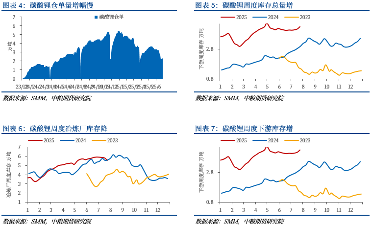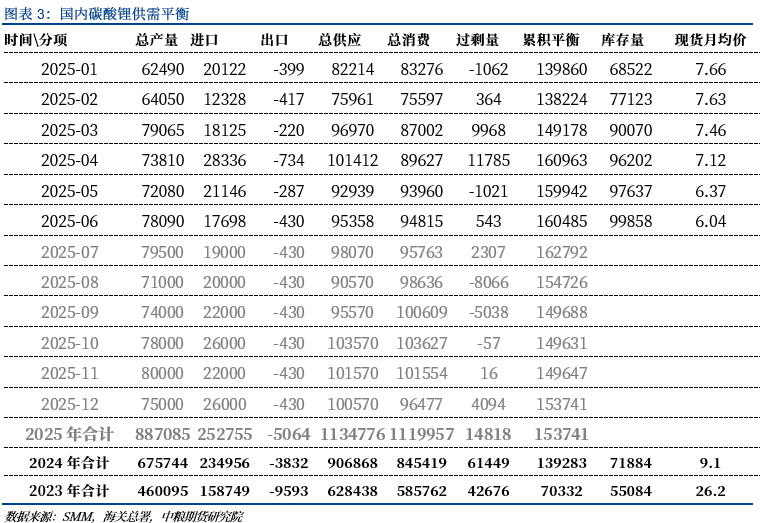 测算8月国内碳酸锂供需,扰动对基本面影响有限,一是采选即便短期停产,企业仍可凭库存原料维持生产,二是期价快速拉升、基差-6000,锂辉石冶炼厂套保利润丰厚,增产消化矿端库存;三是上半年智利进口7.84万吨(同比-0.8万吨),智利全年未减产,若价格继续上行,国内正极厂补库意愿增强,下半年智利货源到港量将回升。综合判断,2025年8月以后供需平衡调整如下: