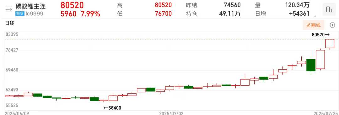 近期受反内卷催化加强及供给端扰动等因素影响,商品市场涨势如潮,做多热情向股市传导。今日碳酸锂主力合约高开高走,日内触及涨停,涨破8万关口。但港股锂业股却集体冲高回落转跌,透露出场内资金分歧心态。