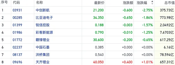 截止发稿,中创新航(03931.HK)跌近3%,赣锋锂业(01772.HK)跌近1%,早盘最高一度涨约4%。天齐锂业(09696.HK)也由最高逾8%的涨幅大幅回落至1%左右。