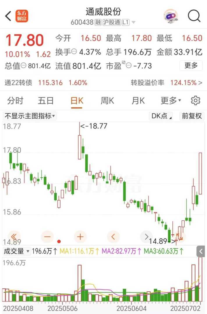 800亿多晶硅巨头通威股份盘中一路拉升,午盘直奔涨停,封单超8万手,成交金额近34亿元,较近期明显放量。