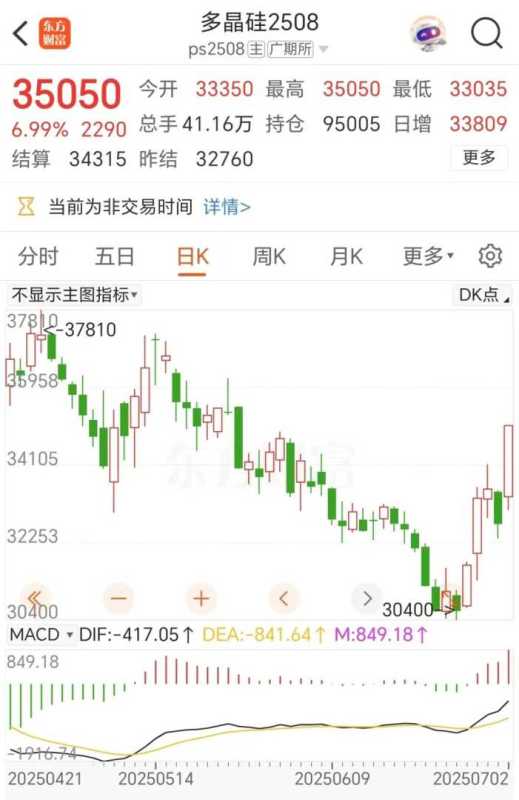 商品期货方面,多晶硅2508主力合约最近五个交易日,该品种有四天上涨,周三早盘更是发动猛攻,高开之后直线拉升,收盘大涨近7%。