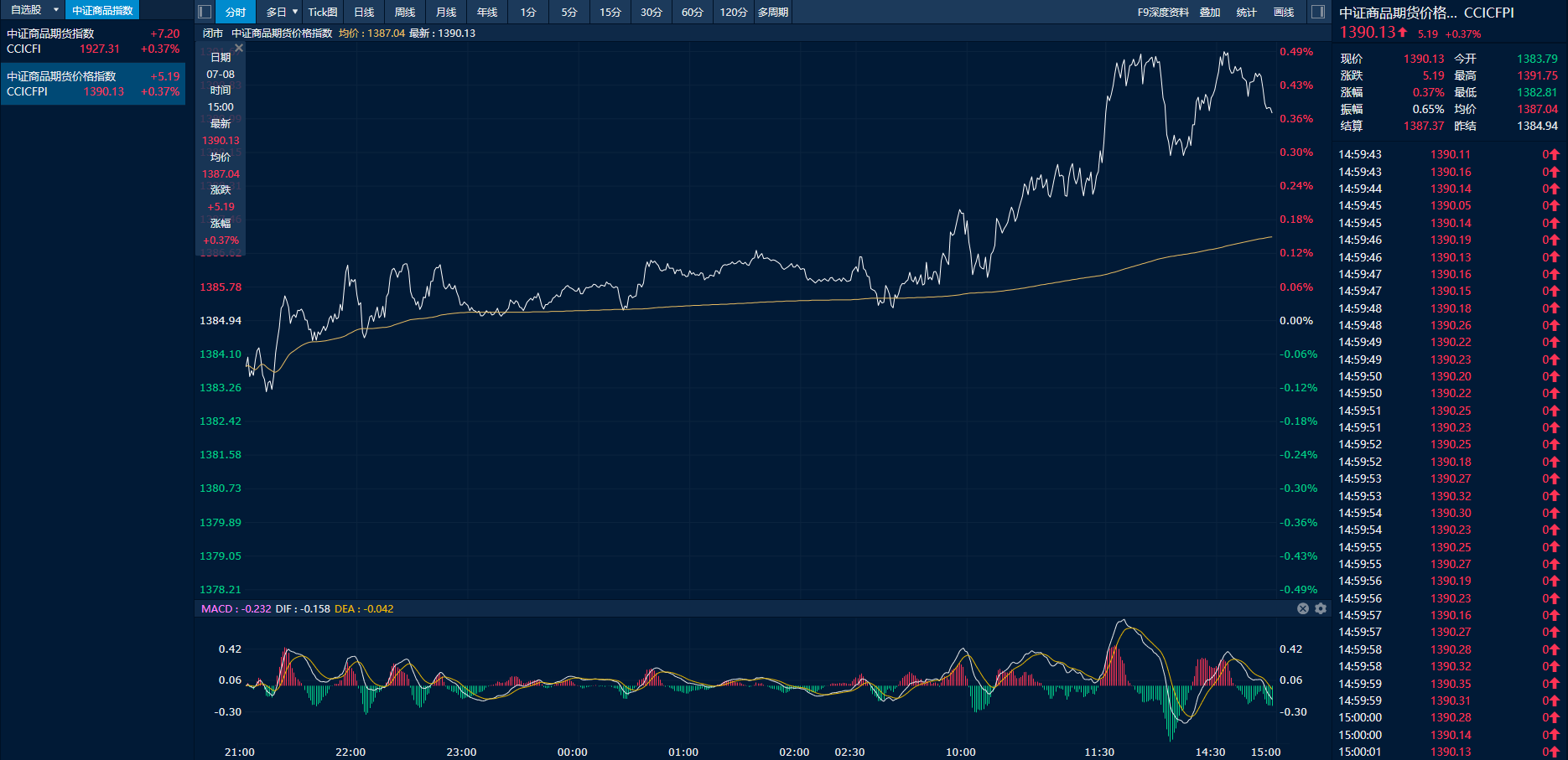 截至8日下午收盘,中证商品期货价格指数收报1390.13点,较前一交易日上涨5.19点,涨幅0.37%;中证商品期货指数收报1927.31点,较前一交易日上涨7.2点,涨幅0.37%。