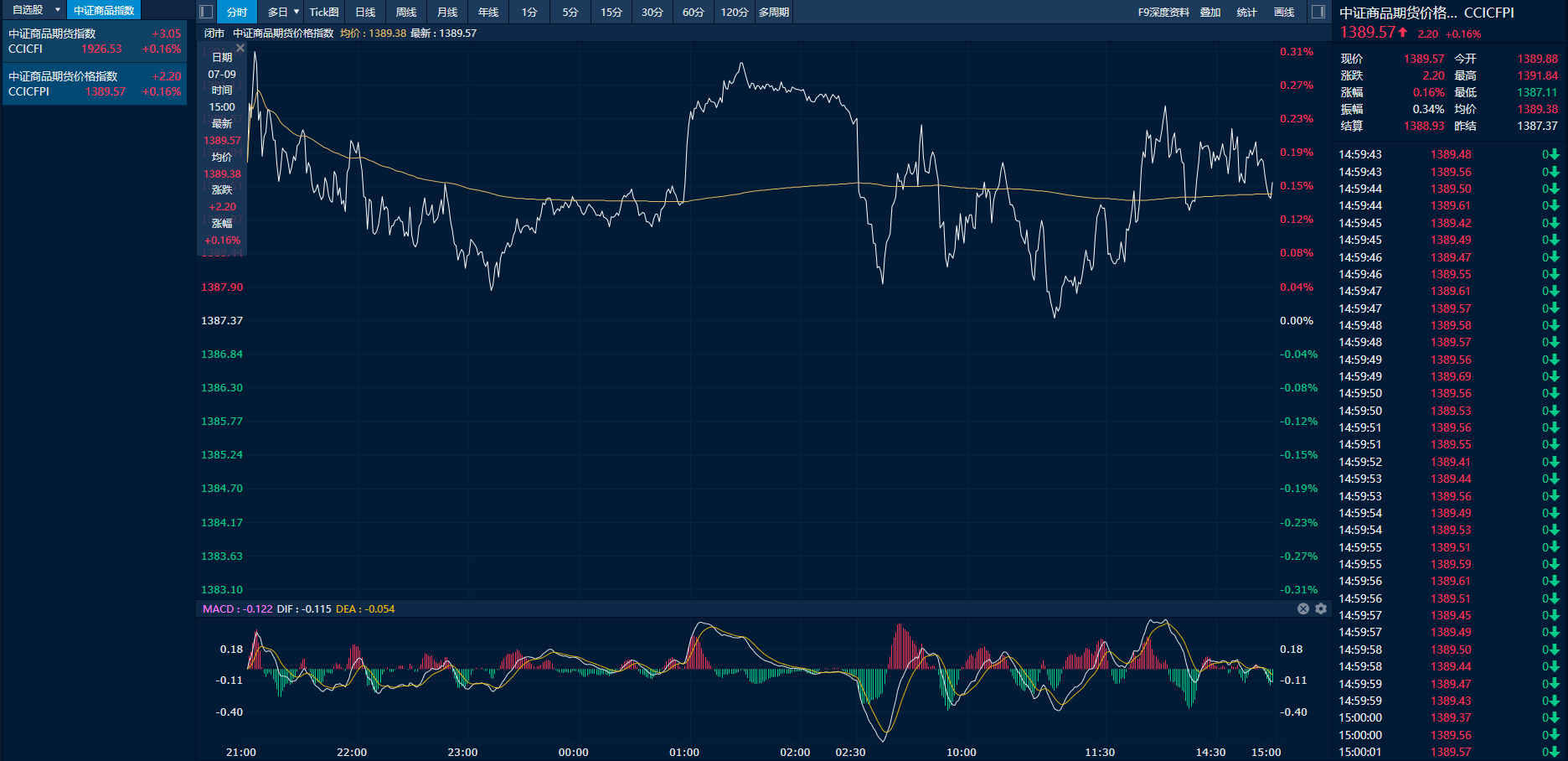 截至9日下午收盘,中证商品期货价格指数收报1389.57点,较前一交易日上涨2.2点,涨幅0.16%;中证商品期货指数收报1926.53点,较前一交易日上涨3.05点,涨幅0.16%。