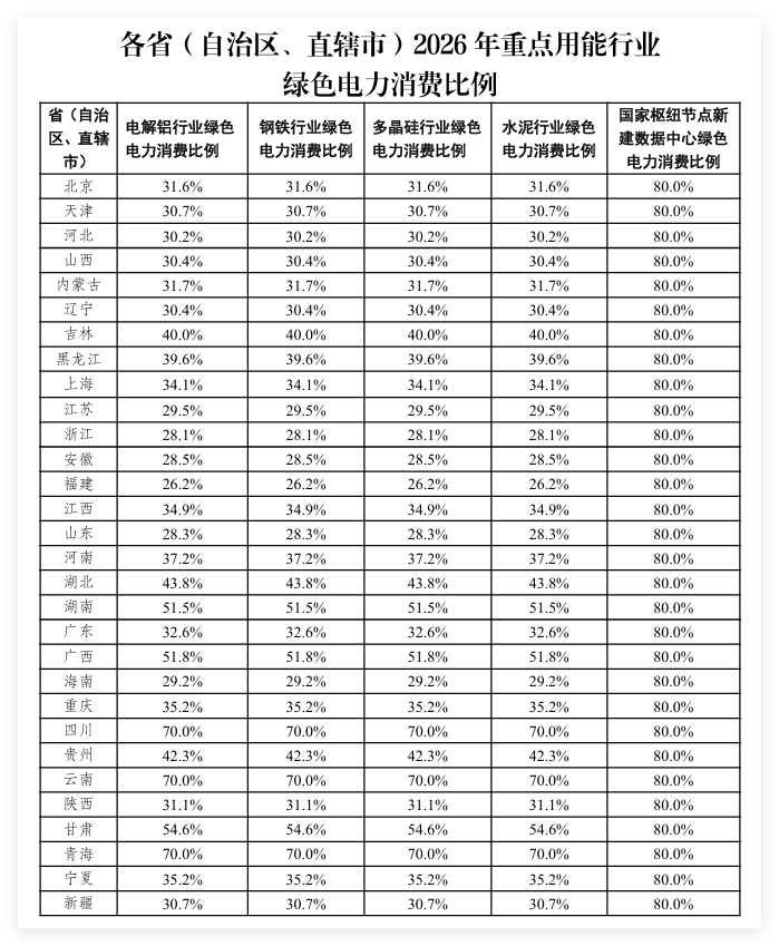 国家发展改革委办公厅、国家能源局综合司发布关于2025年可再生能源电力消纳责任权重及有关事项的通知,为贯彻《中华人民共和国能源法》关于建立绿色能源消费促进机制的要求,落实《2024—2025年节能降碳行动方案》(国发〔2024〕12号)、《关于大力实施可再生能源替代行动的指导意见》(发改能源〔2024〕1537号)、《全国碳排放权交易市场覆盖水泥、钢铁、铝冶炼行业工作方案》(环气候〔2025〕23号)、《数据中心绿色低碳发展专项行动计划》(发改环资〔2024〕970号)等文件要求,在电解铝行业基础上,2025年增设钢铁、水泥、多晶硅行业和国家枢纽节点新建数据中心绿色电力消费比例。