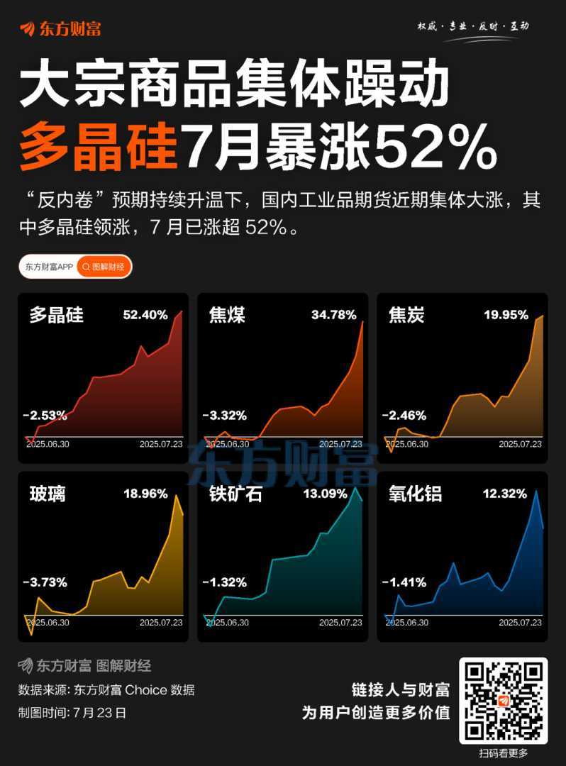 7月23日,多晶硅主力合约盘中暴涨12%,创上市以来新高。国内大宗商品集体上涨,多晶硅期货累计涨幅达52.4%,焦煤、焦炭等工业品期货涨幅居前。市场“反内卷”预期升温,中信证券预计大宗商品价格将回归基本面驱动。