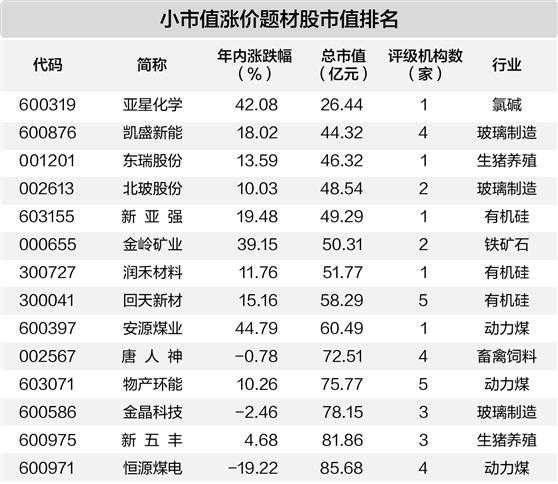 证券时报·数据宝统计出市值低于100亿元且有机构评级的涨价题材个股,主要包括生猪养殖、煤炭、玻璃、有机硅等行业的个股。