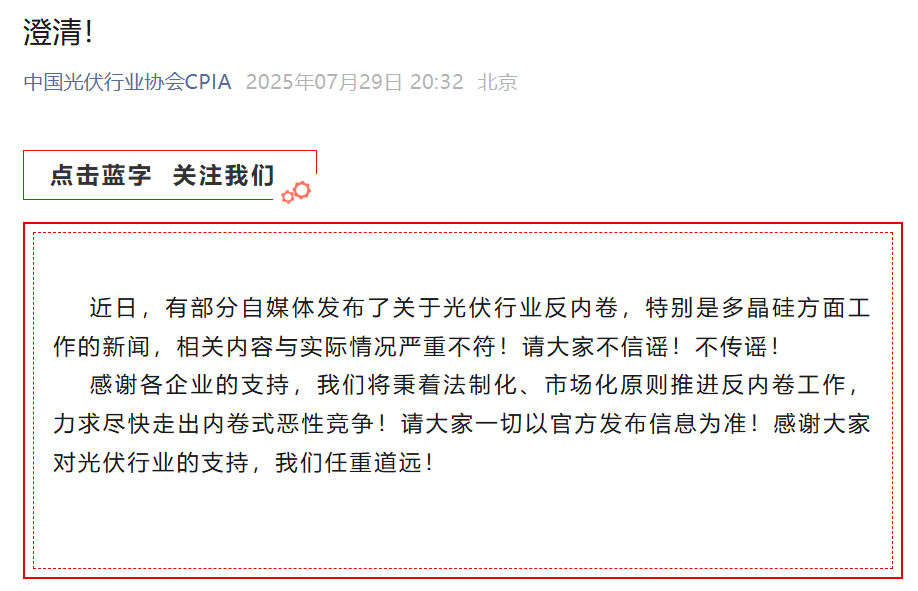7月29日晚间,中国光伏行业协会在官方微信公众号上发布一则澄清信息,称近日有部分自媒体发布了关于光伏行业“反内卷”,特别是多晶硅方面工作的新闻。该协会称“相关内容与实际情况严重不符,请大家不信谣,不传谣”。