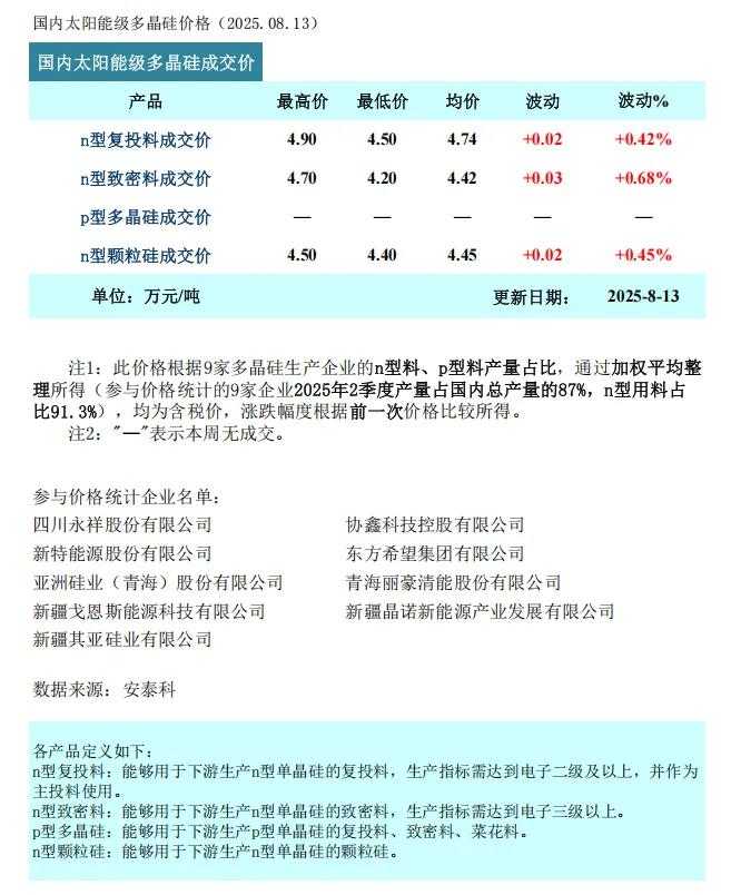 新华财经北京8月13日电据中国有色金属工业协会硅业分会消息,本周多晶硅n型复投料成交价格区间为4.5-4.9万元/吨,成交均价为4.74万元/吨,周环比上涨0.42%。n型颗粒硅成交价格区间为4.4-4.5万元/吨,成交均价为4.45万元/吨,周环比上涨0.45%。