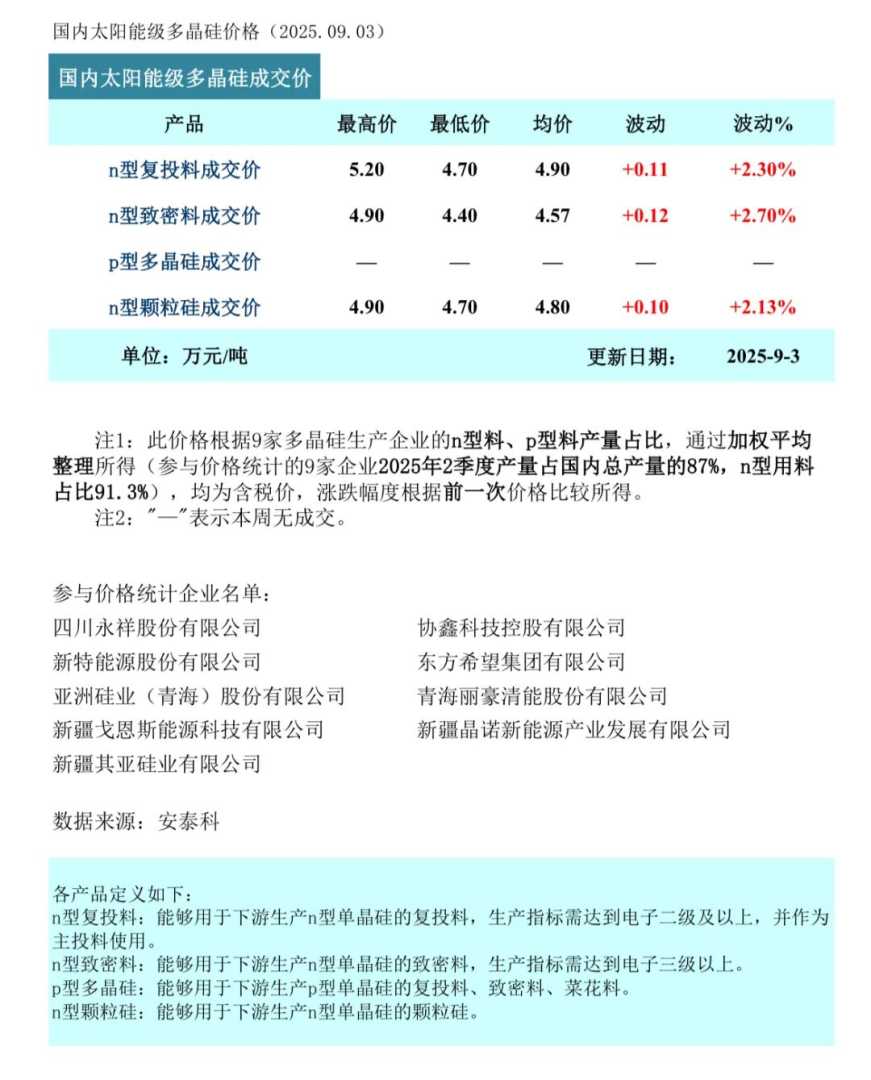 9月3日,中国有色金属工业协会硅业分会发布多晶硅成交价格,n型复投料、致密料、颗粒硅成交均价均上涨,为光伏产业市场注入新活力。