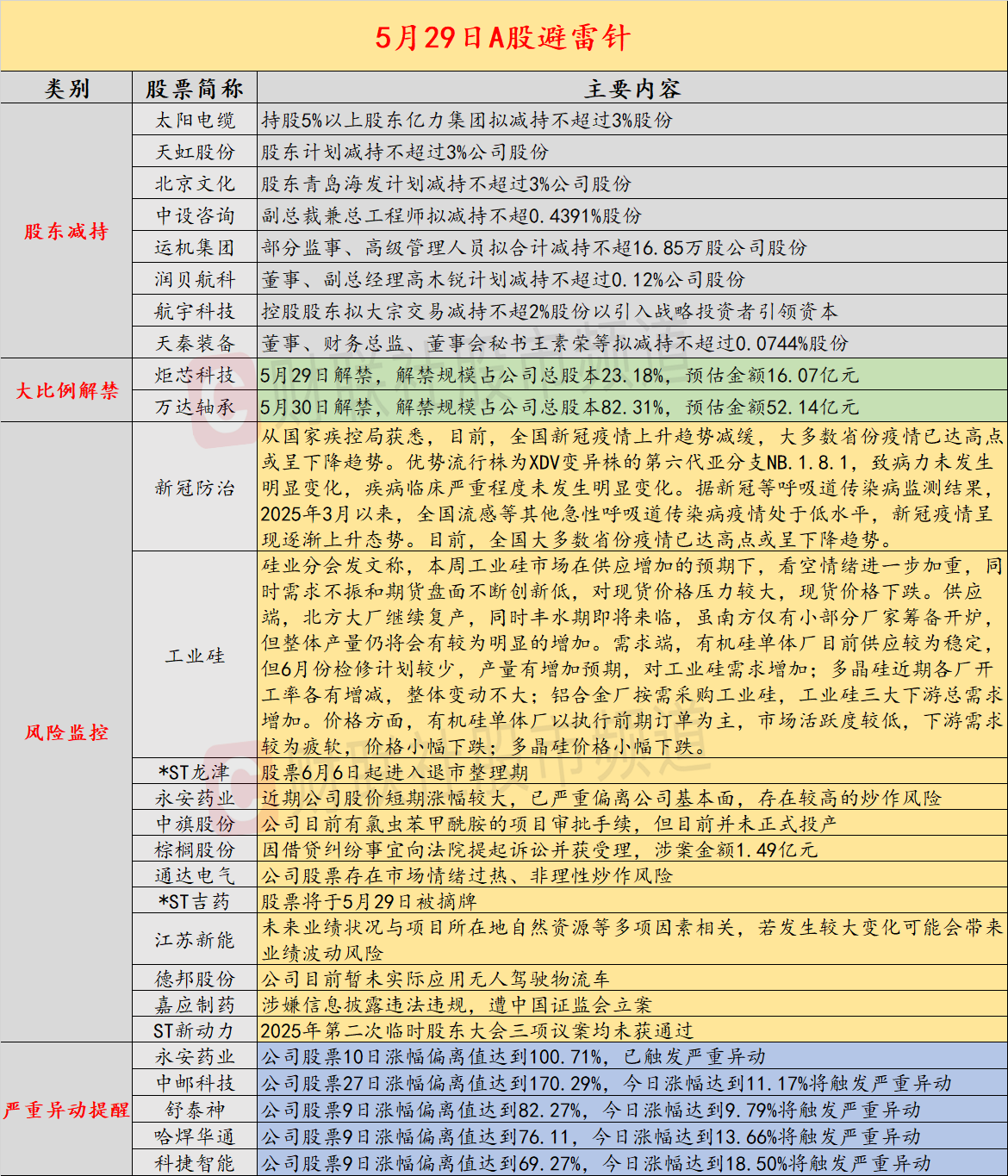 财联社5月29日发布投资避雷针,概述A股及海外市场潜在风险事件。国内经济信息方面,全国疫情上升趋势减缓,工业硅现货价格小幅下跌。公司方面,*ST龙津、永安药业等公司发布减持预警。海外市场,美股三大指数集体收跌,热门科技股多数下跌,渣打称2026年美元可能大幅下跌。