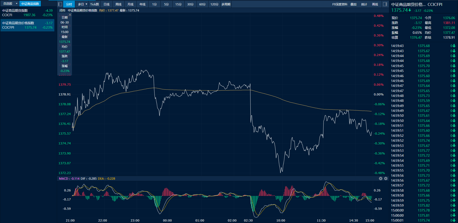 截至30日下午收盘,中证商品期货价格指数收报1375.74点,较前一交易日下跌3.17点,跌幅0.23%;中证商品期货指数收报1907.36点,较前一交易日下跌4.39点,跌幅0.23%。