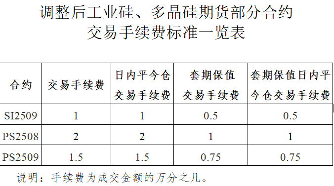 广期所发布通知,自2025年7月21日起调整工业硅期货SI2509及多晶硅期货PS2508、PS2509合约的交易手续费标准,包括日内平今仓交易手续费。