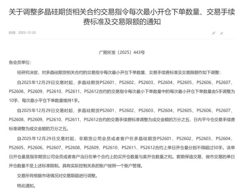 25日晚间,广期所调整多晶硅期货相关合约交易指令每次最小开仓下单数量、交易手续费标准及交易限额。