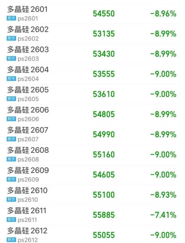 1月8日,多晶硅期货多个合约午后跌停,截至午盘收盘,主力2605合约报53610元/吨,下跌9%。